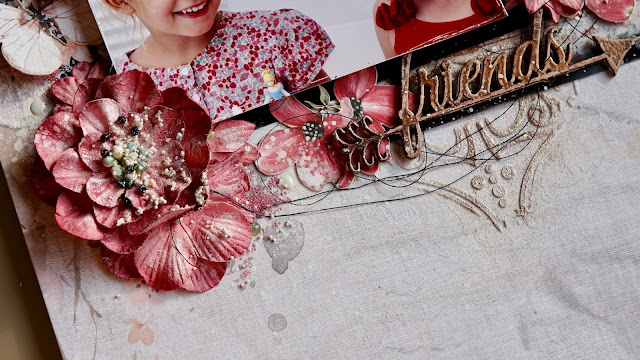 J’ai utilisé les chipboards « Hexagon Outline Frames Set » pour structurer ma composition. Je les ai disposés de manière fluide sur la page afin de guider le regard vers la photo. Pour les embellir, j’ai appliqué les encres Distress Oxide Walnut Stain et Vintage Photo, puis j’ai ajouté légèrement du Black Soot sur les bords pour apporter de la profondeur. J’ai terminé en vaporisant un peu d’eau afin de créer de subtiles taches oxydées, apportant texture et intérêt tout en conservant un rendu doux et délicat.