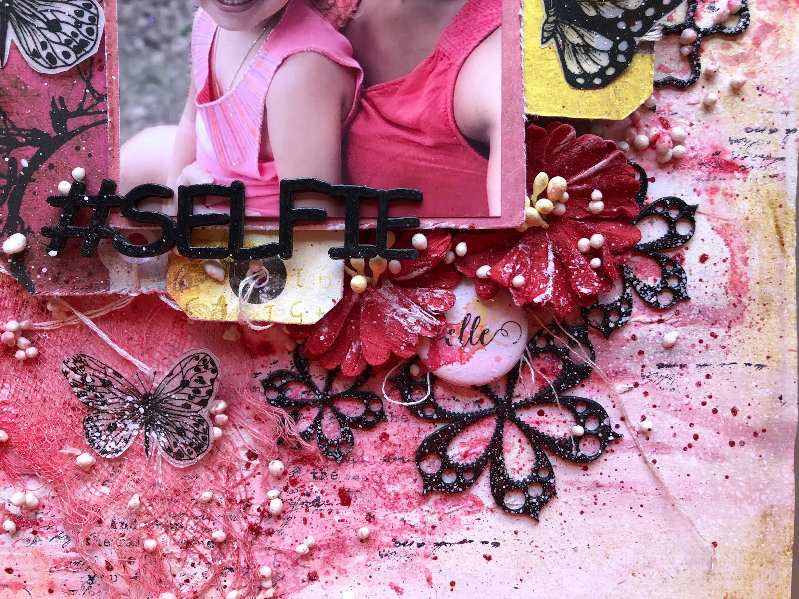J'ai travaillé mon fond de page avec du gesso blanc, des pochoirs, des encres, des tampons pour faire un effet mixed média...