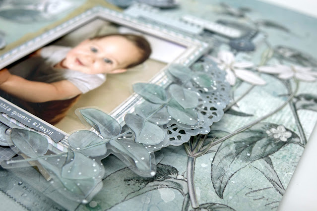 J’ai choisi le papier « color-swatch-eucalyptus-paper-3 » j’ai commencé par faire mon tas de papier sur ma photo en utilisant des papiers de « vintage-artistry-tranquility-ephemera-bits » une feuille de « color-swatch-eucalyptus-collage-sheets » que j’ai légèrement froissée et des « color-swatch-eucalyptus-laser-cut-elements ». Notamment ce napperon en dentelle. J’insère du carton pour élever le tout.